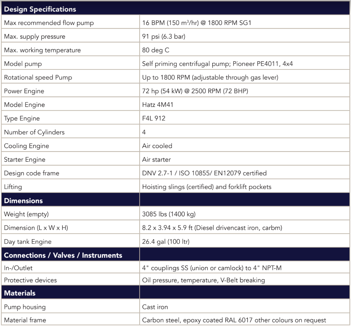 Our diesel driven pump set is designed to work in the most harsh conditions. The air cooled 4 cylinder diesel engine is the most reliable and robust engine in the market. Only compressed air is required to start the package. The Gorman Rupp self priming pump is designed for pumping dirty fluids and can withstand aggrieve fluids. All equipment is built into a strong boxframe for easy transportation and protection.